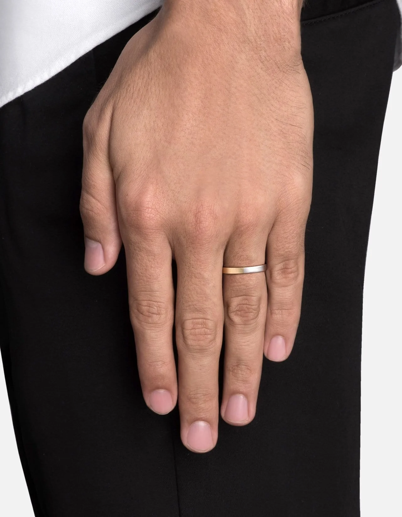 The men's Edge Ring is versatilely designed to give you the best of both worlds. This effortlessly cool band is handcrafted and made to order using 14k white and yellow gold. The matte exterior and polished interior is perfect for a modern groom, or your new everyday ring.