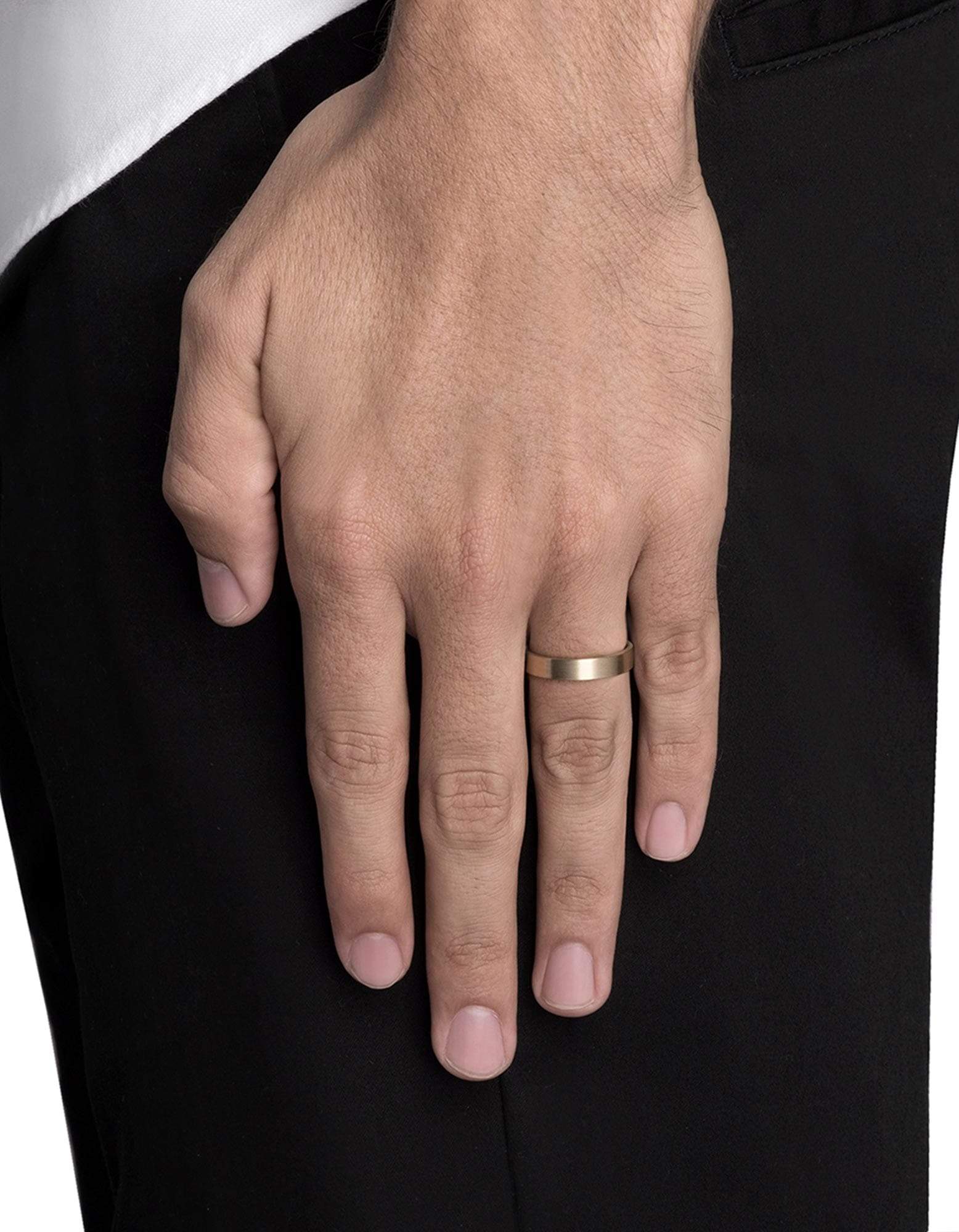 This 4mm band for men, is intricately made in 14 karat gold with a matte finish and brilliantly designed to define elevated craftsmanship.